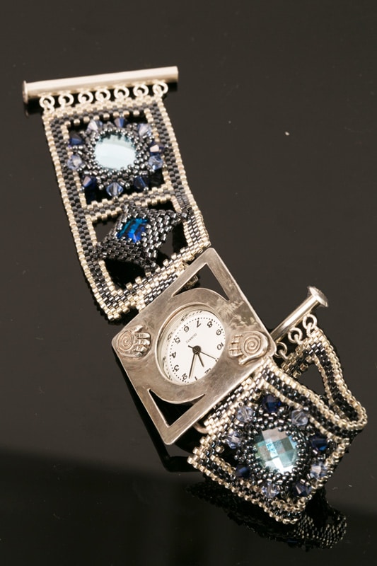 משולב ברצועת חרוזים ואבני סברובסקי מיוחדת גמישה ונוחה על היד בעיצוב אישי