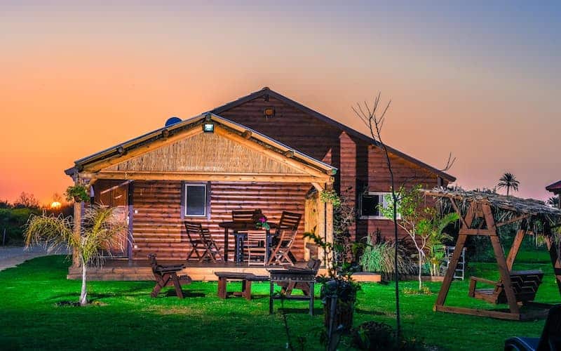 לכל בקתה חצר מטופחת וירוקה עם פינות ישיבה מעץ, פינת מנגל וחנייה צמודה.