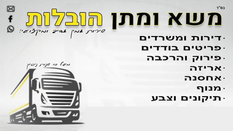 קצת עלינו משא ומתן הובלות – בעלי ותק של מעל 10 שנות ניסיון הן בתחום ההרכבות והן בתחום ההובלות. אנו מציעים מגוון שירותים וביניהם הובלות גדולות וקטנות, פירוק, תיקון והרכבת ריהוט, תליה וקיבוע, שירותי מנוף, אריזה, אחסנה, ושינוע הניתנים ע"י צוות אדיב, חייכן, מקצועי ומיומן ומתבצעים בסדר מסוים ובזהירות רבה תוך כדי שמירה על חפציכם. מחירים אטרקטיביים והוגנים!*בעל המלצות חמות-מוזמנים להתרשם בדף הפייסבוק*