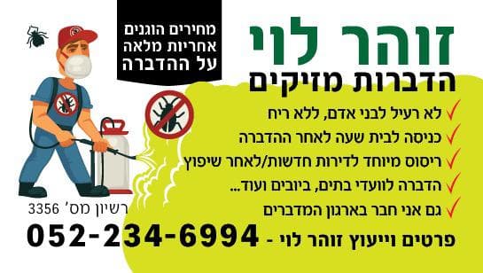 אני נותן יעוץ טלפוני חינם 24/7 , מדורג 9.4 נותן בשרות, זמינות מידית. הדברה ירוקה תיקנים, נמלים, צרעות, פשפשים, קרציות , חולדות, עכברים, כל סוגי ההדברות . הרחקת ויונים ,השרות ניתן לאנשים פרטיים, ולמוסדות חברתיים וציבוריים אני מעניק שירות אמין ומקצועי מכל הלב! במחירים הוגנים תוך דגש על מקצועיות גבוהה, רישיון מדביר מוסמך 3356 אני מגיע לזיהוי ראשוני ונותן יעוץ, פתרונות וטיפול במקום.